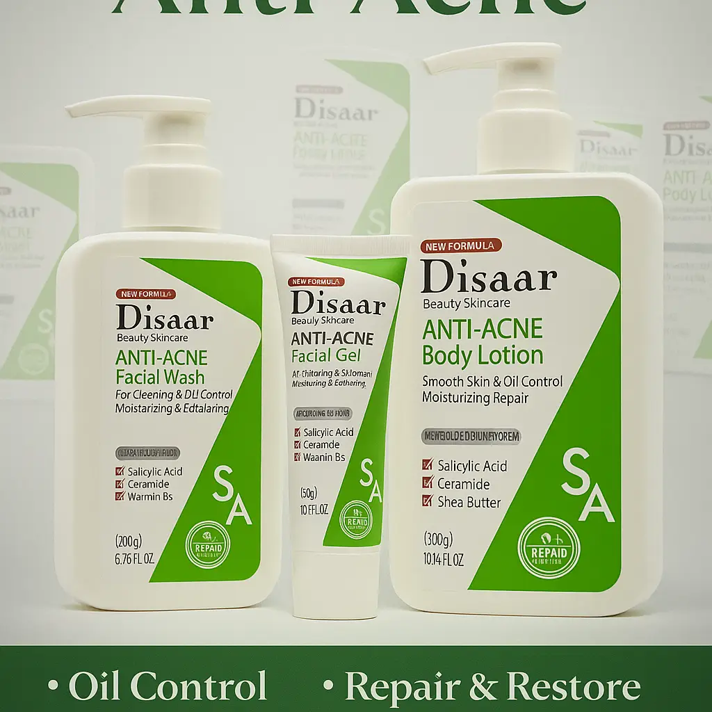 Clear and nourish your skin with the Disaar Anti-Acne Skincare Bundle, including facial wash, facial gel, and body lotion. Enriched with salicylic acid, ceramide, and vitamin B5 for oil control, acne reduction, and smooth, healthy skin. Perfect for Pakistani skin concerns caused by heat, dust, and pollution.